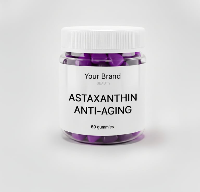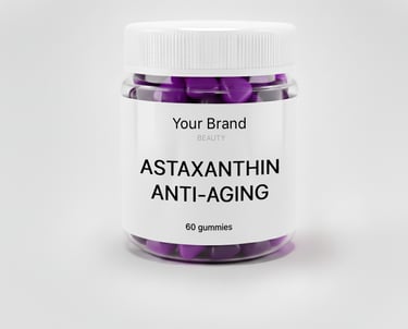 Astaxanthin is 6000x stronger than vitamin C and 550x stronger than vitamin E as an antioxidant. Clinical studies show 6mg daily prevents worsening of wrinkles and skin moisture loss, while improving elasticity and reducing crow's feet within 6-8 weeks. Protects against UV-induced skin damage and inhibits enzymes that break down collagen. The pink-red pigment that gives salmon and shrimp their color.