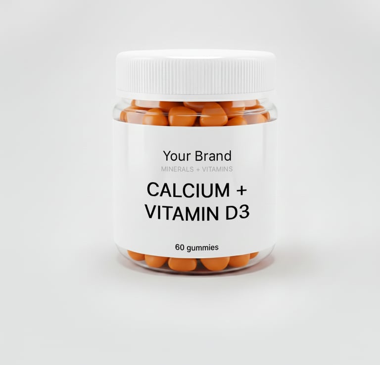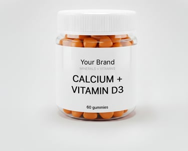 Calcium needs Vitamin D for proper absorption. This combination is the standard for bone health supplements. Strong demand from women 40+ and elderly consumers.