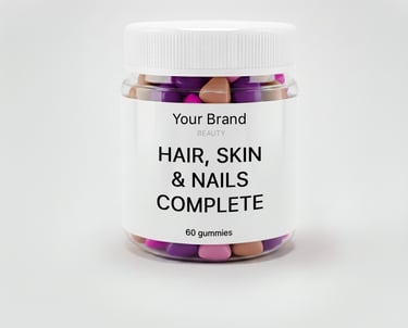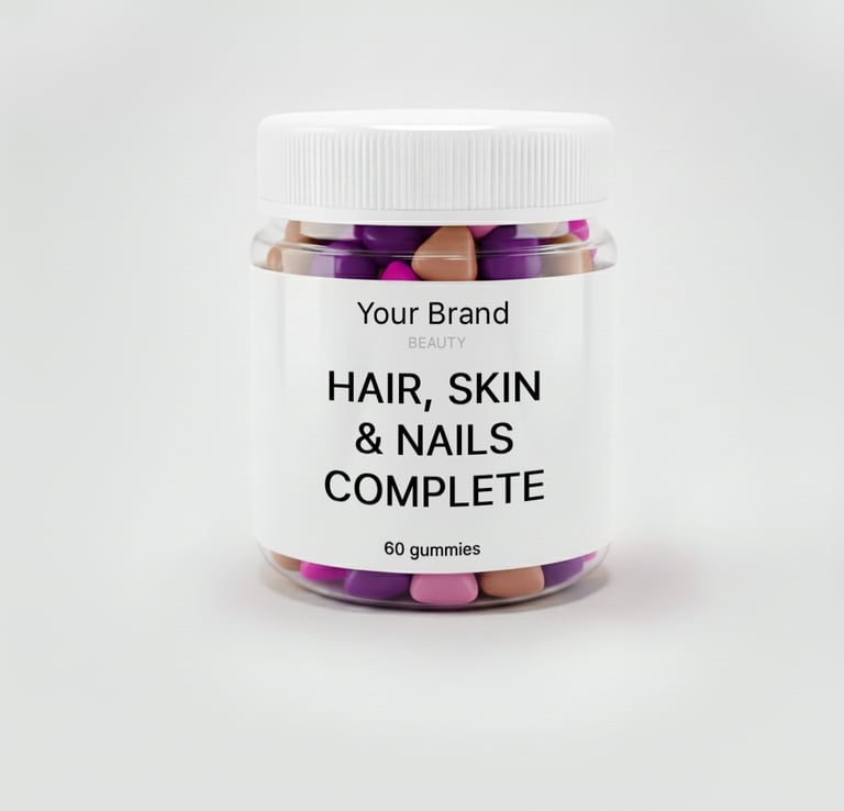 Comprehensive formula combining the most researched beauty nutrients in one convenient serving. Collagen for structure, biotin for keratin synthesis, hyaluronic acid for hydration, vitamin C for collagen production, vitamin E for antioxidant protection, zinc for tissue repair, selenium for hair follicle health. The go-to product for customers who want complete coverage without multiple supplements.