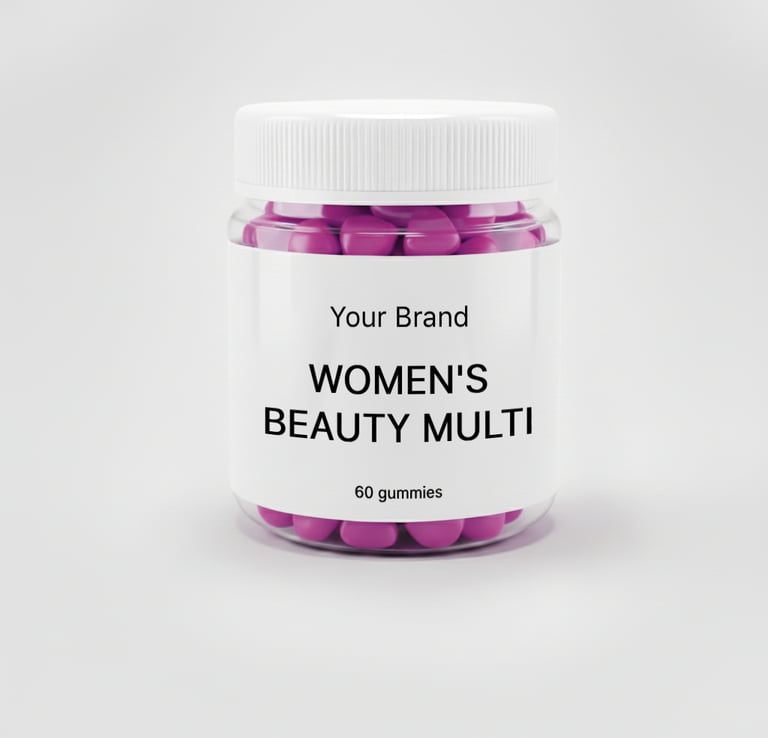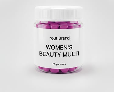 Multivitamin with boosted beauty benefits. Extra Biotin, Vitamin E, and collagen-supporting nutrients for hair, skin, and nails. Highly marketable to 18-35 age group. Influencer favorite.